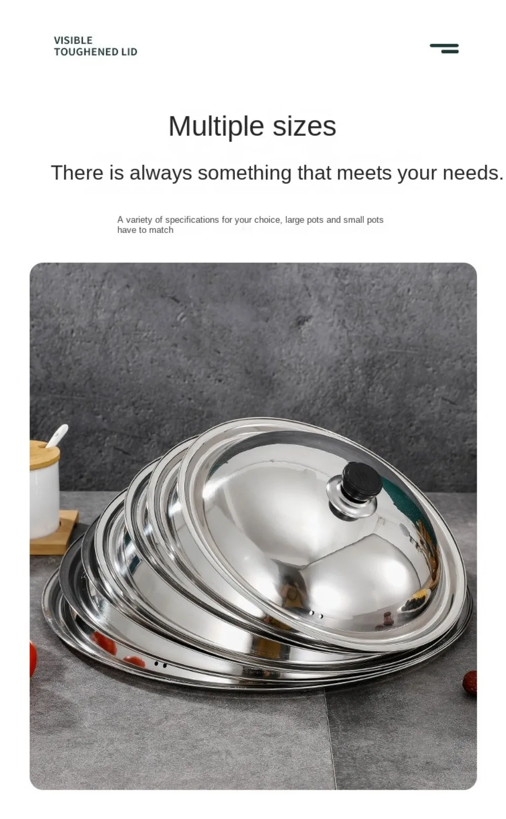 2. **Multiple Size Options**: Available in a range of sizes (28cm(11.02in), 30cm(11.81in), 32cm(12.60in), 34cm(13.39in), and 36cm(14.17in)), these lids are designed to fit a variety of pots and pans, providing a versatile solution for all your cooking needs. This flexibility ensures that you have the right lid for every pot or pan in your kitchen.